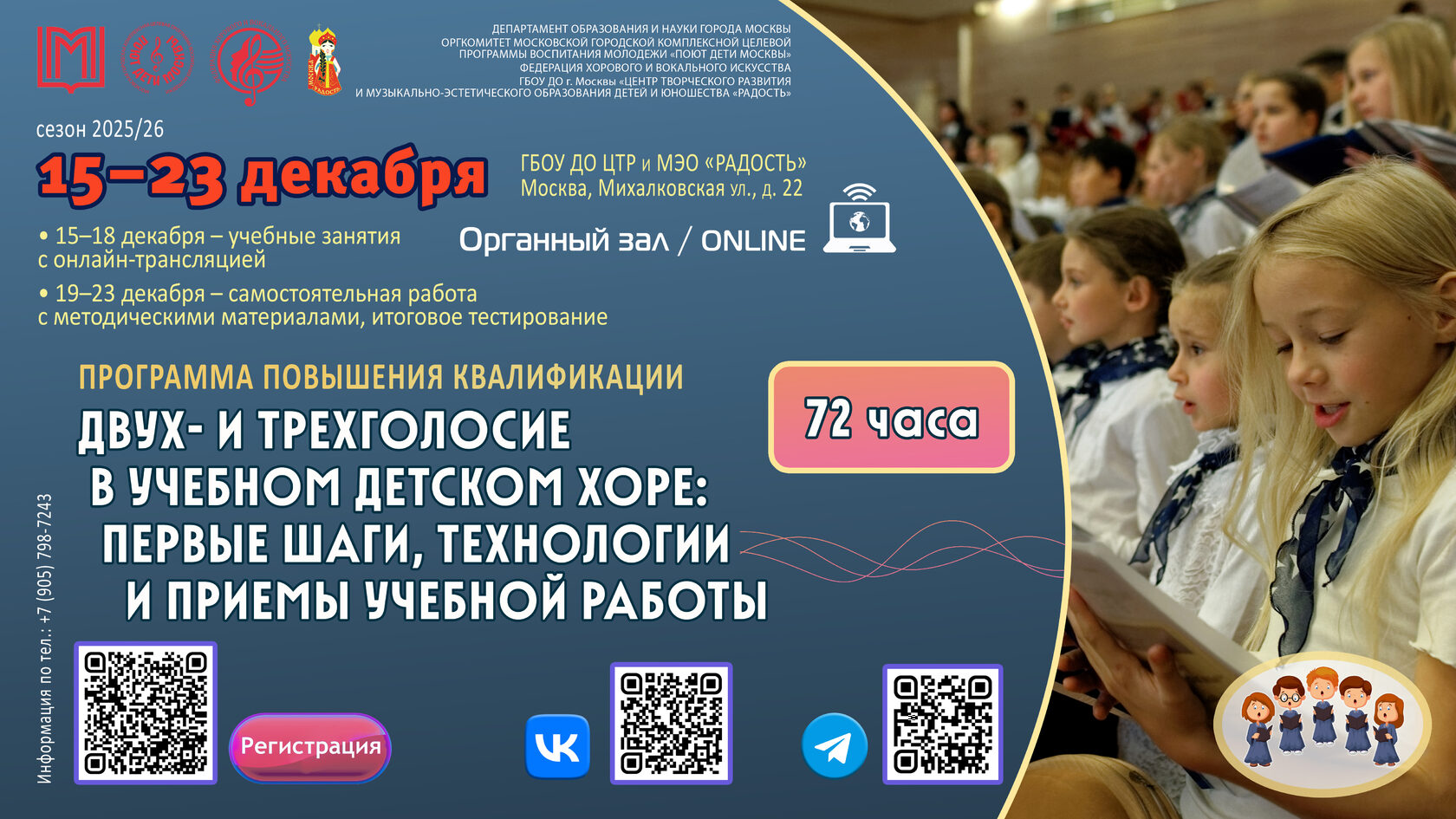 📢 Приглашаем педагогов-хормейстеров, учителей музыки, преподавателей хоровых и вокальных классов на обучение по программе «Двух- и трехголосие в учебном детском хоре: первые шаги, технологии и приемы учебной работы».