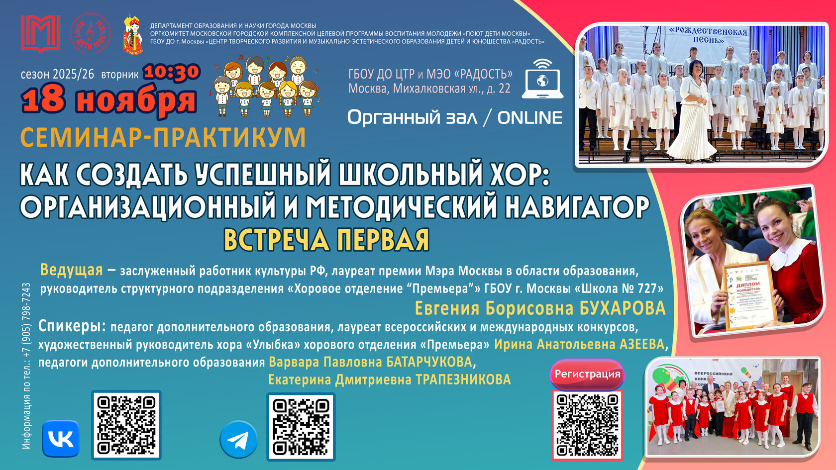 🗣 Ведущая семинара-практикума – заслуженный работник культуры РФ, лауреат премии Мэра Москвы в области образования, руководитель структурного подразделения «Хоровое отделение “Премьера”» ГБОУ г. Москвы «Школа № 727» Евгения Борисовна БУХАРОВА